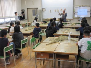 本日、5年生で地域の方々にしめ縄作りを教えていただきました。