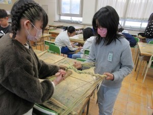 友だちと協力しながら作り上げ、世界に一つのだけのしめ縄を完成させました。